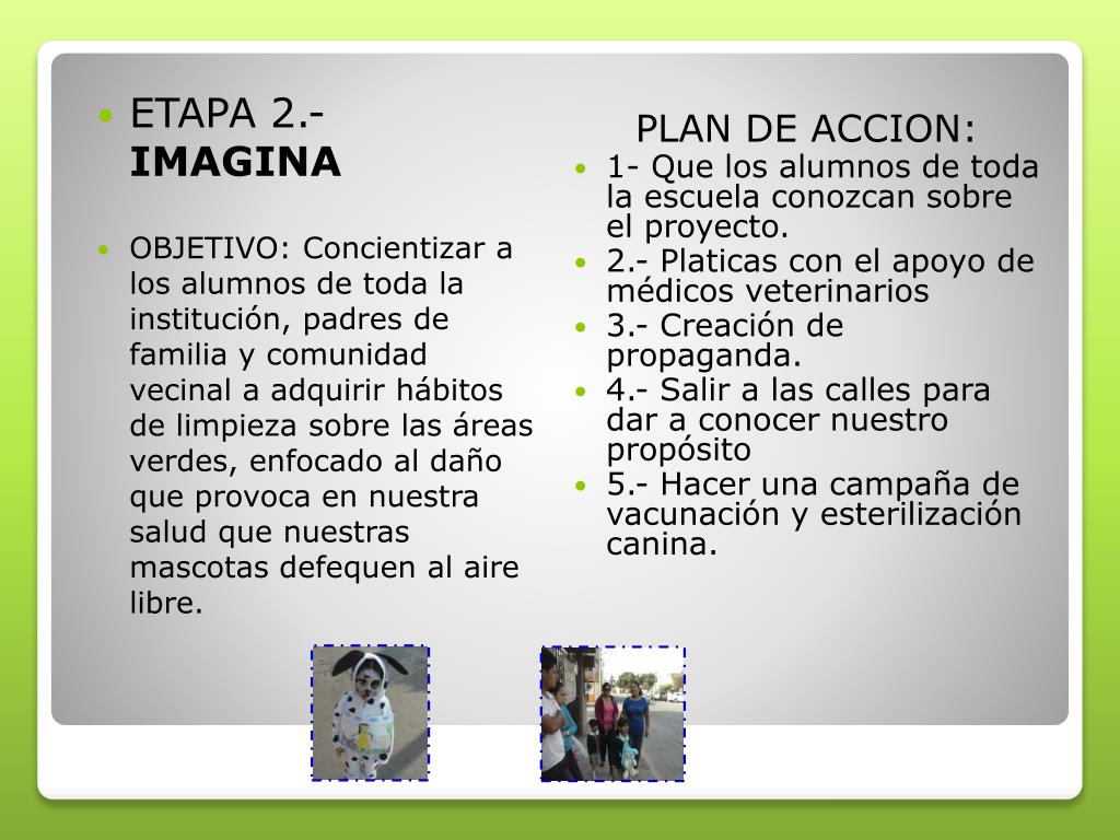 ETAPA 2.- IMAGINA • OBJETIVO: Concientizar a los alumnos de toda la institución, padres de familia y comunidad vecinal a adquirir hábitos de limpieza sobre las áreas verdes, enfocado al daño que provoca en nuestra salud que nuestras mascotas defequen al aire libre. PLAN DE ACCION: • 1- Que los alumnos de toda la escuela conozcan sobre el proyecto. • 2.- Platicas con el apoyo de médicos veterinarios • 3.- Creación de propaganda. • 4.- Salir a las calles para dar a conocer nuestro propósito • 5.- Hacer una campaña de vacunación y esterilización canina.
