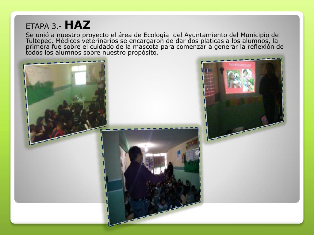 ETAPA 3.- HAZ Se unió a nuestro proyecto el área de Ecología del Ayuntamiento del Municipio de Tultepec. Médicos veterinarios se encargaron de dar dos platicas a los alumnos, la primera fue sobre el cuidado de la mascota para comenzar a generar la reflexión de todos los alumnos sobre nuestro propósito.