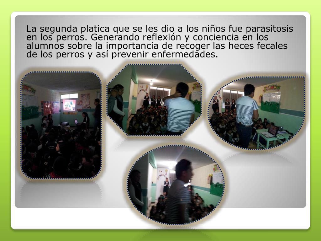 La segunda platica que se les dio a los niños fue parasitosis en los perros. Generando reflexión y conciencia en los alumnos sobre la importancia de recoger las heces fecales de los perros y así prevenir enfermedades.