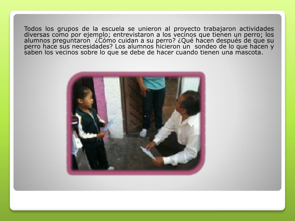 Todos los grupos de la escuela se unieron al proyecto trabajaron actividades diversas como por ejemplo; entrevistaron a los vecinos que tienen un perro; los alumnos preguntaron ¿Cómo cuidan a su perro? ¿Qué hacen después de que su perro hace sus necesidades? Los alumnos hicieron un sondeo de lo que hacen y saben los vecinos sobre lo que se debe de hacer cuando tienen una mascota.
