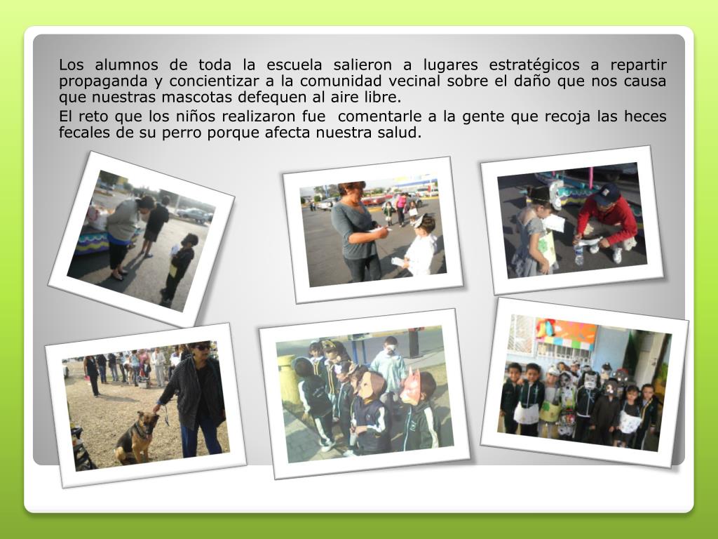 Los alumnos de toda la escuela salieron a lugares estratégicos a repartir propaganda y concientizar a la comunidad vecinal sobre el daño que nos causa que nuestras mascotas defequen al aire libre. El reto que los niños realizaron fue comentarle a la gente que recoja las heces fecales de su perro porque afecta nuestra salud.