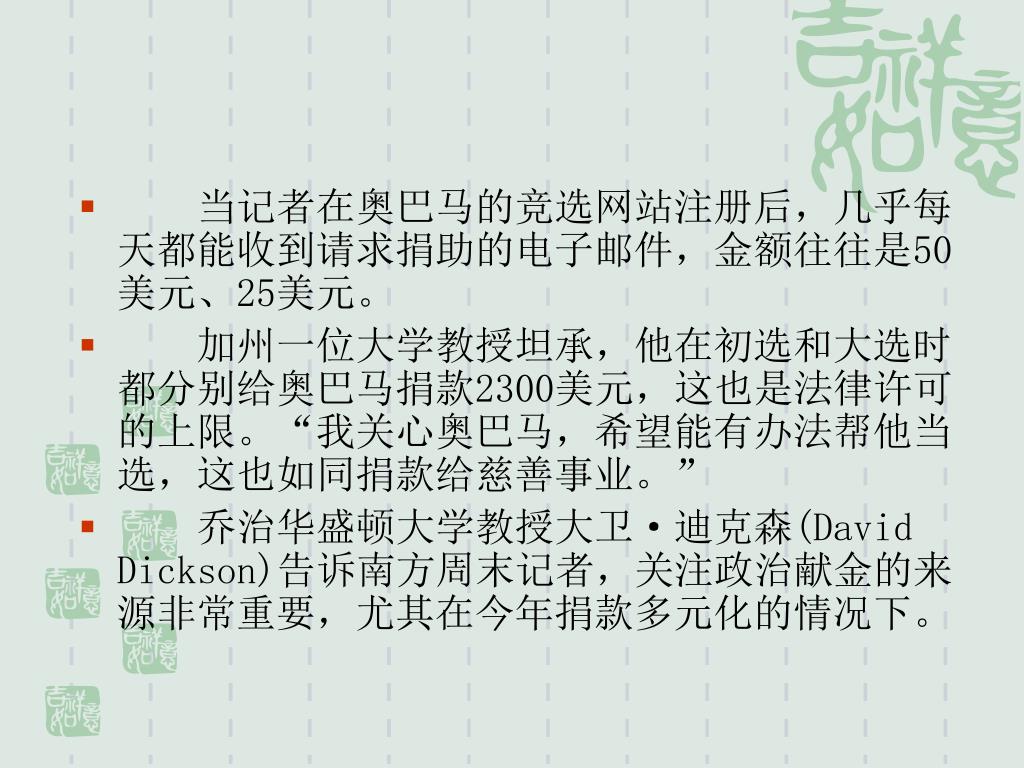 当记者在奥巴马的竞选网站注册后,几乎每天都能收到请求捐助的电子邮件,金额往往是50美元、25美元。当记者在奥巴马的竞选网站注册后,几乎每天都能收到请求捐助的电子邮件,金额往往是50美元、25美元。 • 加州一位大学教授坦承,他在初选和大选时都分别给奥巴马捐款2300美元,这也是法律许可的上限。“我关心奥巴马,希望能有办法帮他当选,这也如同捐款给慈善事业。” • 乔治华盛顿大学教授大卫·迪克森(David Dickson)告诉南方周末记者,关注政治献金的来源非常重要,尤其在今年捐款多元化的情况下。