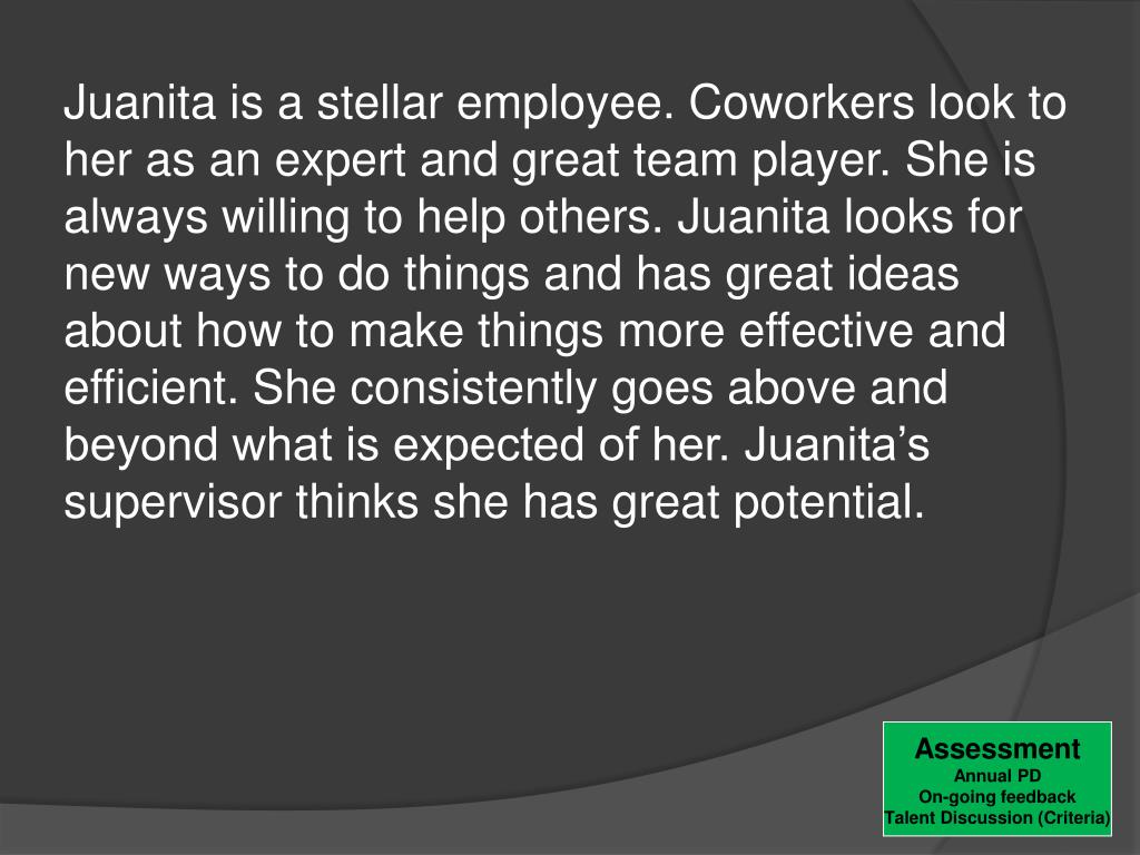 Juanita is a stellar employee. Coworkers look to her as an expert and great team player. She is always willing to help others. Juanita looks for new ways to do things and has great ideas about how to make things more effective and efficient. She consistently goes above and beyond what is expected of her. Juanita’s supervisor thinks she has great potential. Assessment Annual PD On-going feedback Talent Discussion (Criteria)