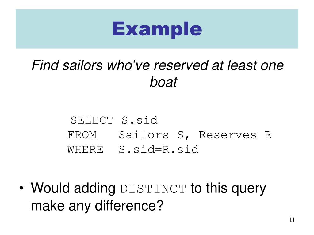 Example Find sailors who’ve reserved at least one boat SELECT S.sid FROM Sailors S, Reserves R WHERE S.sid=R.sid • Would adding DISTINCT to this query make any difference?