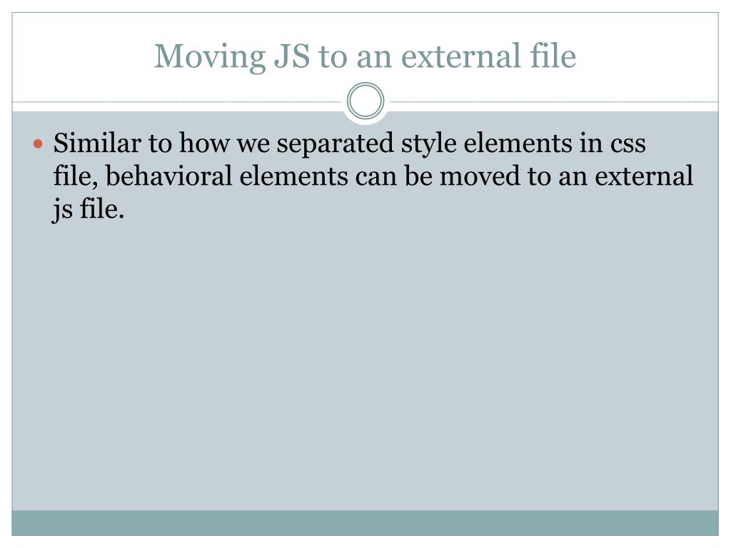 Moving JS to an external file Similar to how we separated style elements in css file, behavioral elements can be moved to an external js file.