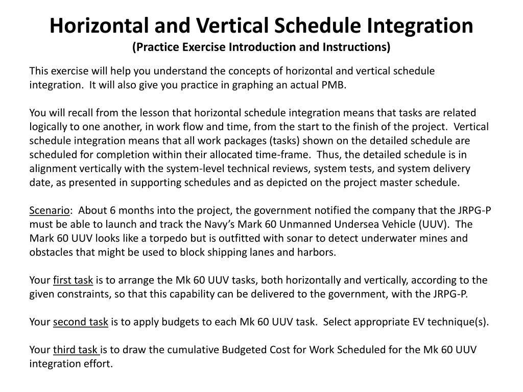 Horizontal and Vertical Schedule Integration (Practice Exercise Introduction and Instructions). This exercise will help you understand the concepts of horizontal and vertical schedule integration. It will also give you practice in graphing an actual PMB.