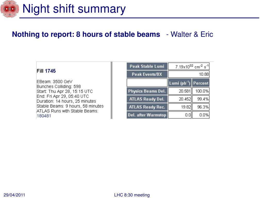 Fill 1745 20:57 Start ramp 21:41 Stable beams LHC 8:30 meeting