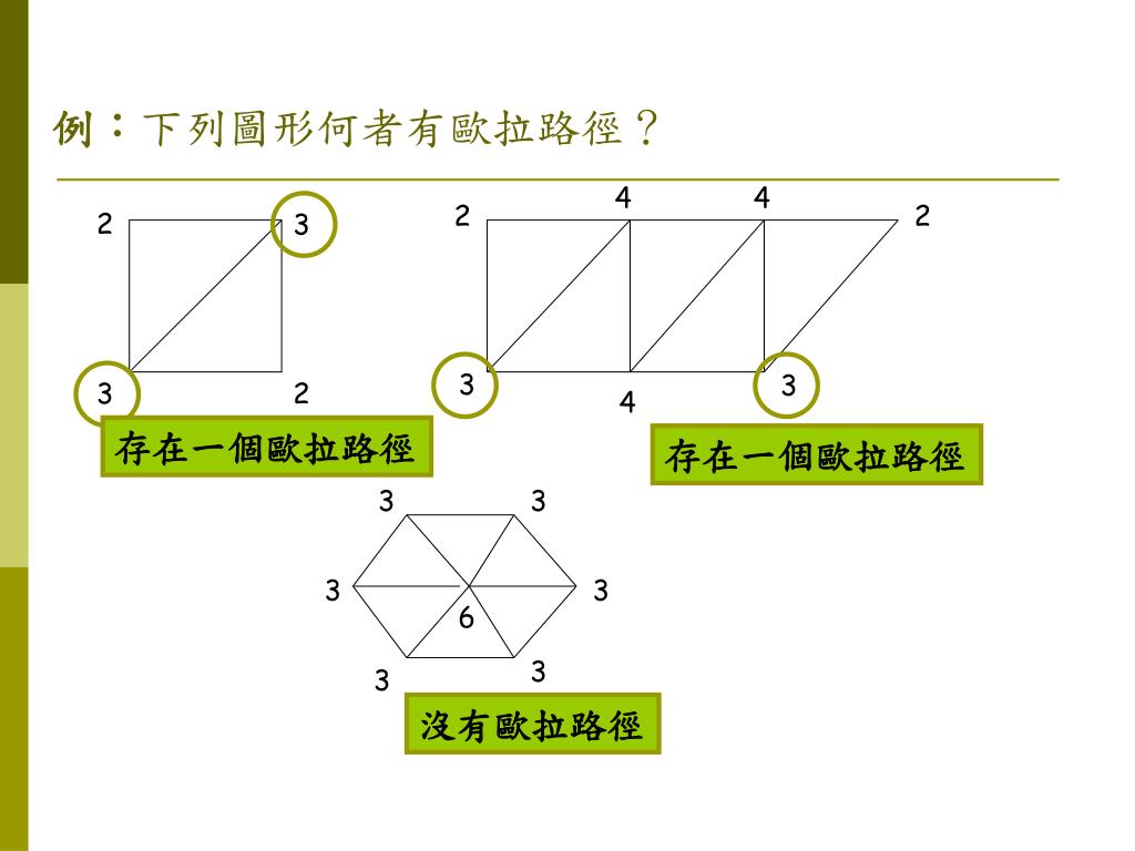例:下列圖形何者有歐拉路徑? 4 4 2 2 2 3 3 3 3 2 4 存在一個歐拉路徑 存在一個歐拉路徑 3 3 3 3 6 3 3 沒有歐拉路徑