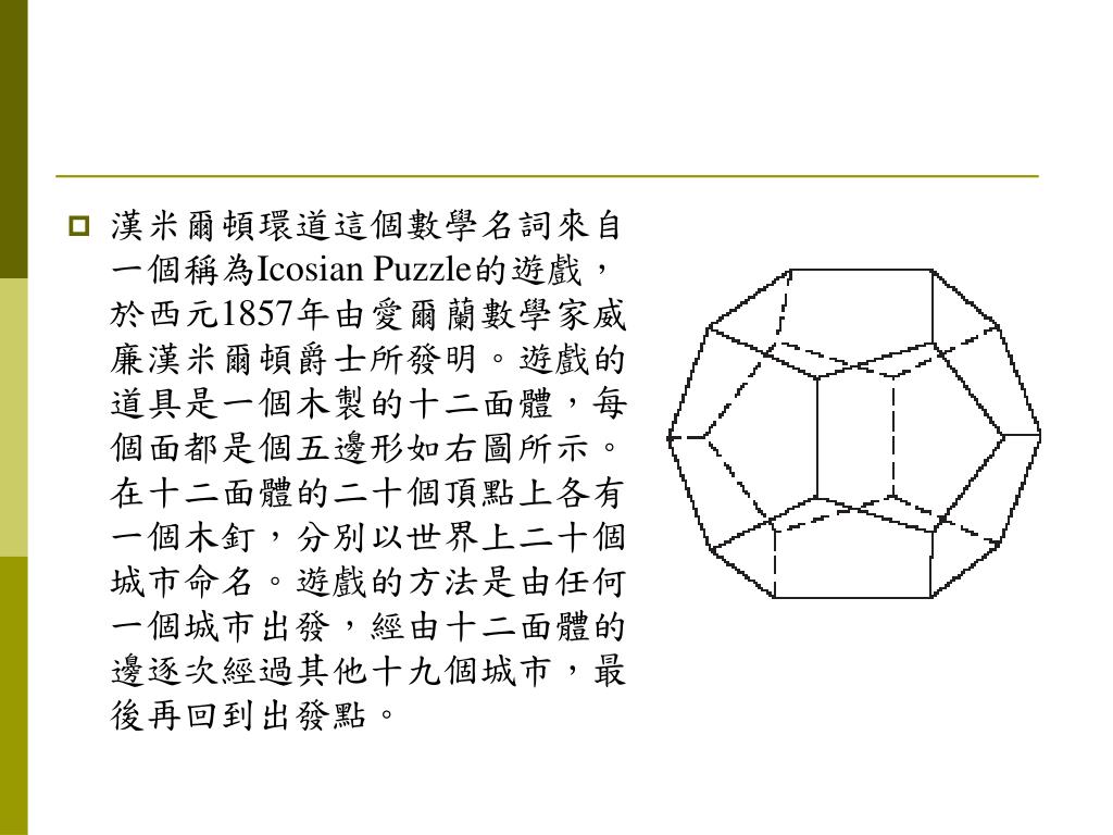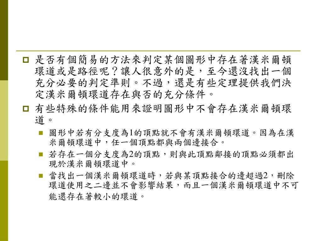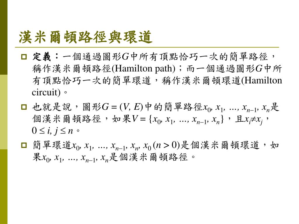 漢米爾頓路徑與環道 • 定義:一個通過圖形G中所有頂點恰巧一次的簡單路徑,稱作漢米爾頓路徑(Hamilton path);而一個通過圖形G中所有頂點恰巧一次的簡單環道,稱作漢米爾頓環道(Hamilton circuit)。 • 也就是說,圖形G = (V, E)中的簡單路徑x0, x1, …, xn1, xn是個漢米爾頓路徑,如果V = {x0, x1, …, xn1, xn},且xixj, 0 i, j n。 • 簡單環道x0, x1, …, xn1, xn, x0 (n > 0)是個漢米爾頓環道,如果x0, x1, …, xn1, xn是個漢米爾頓路徑。
