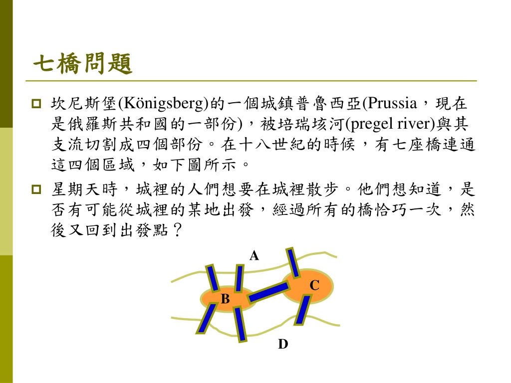 A C B D 七橋問題 • 坎尼斯堡(Königsberg)的一個城鎮普魯西亞(Prussia,現在是俄羅斯共和國的一部份),被培瑞垓河(pregel river)與其支流切割成四個部份。在十八世紀的時候,有七座橋連通這四個區域,如下圖所示。 • 星期天時,城裡的人們想要在城裡散步。他們想知道,是否有可能從城裡的某地出發,經過所有的橋恰巧一次,然後又回到出發點?