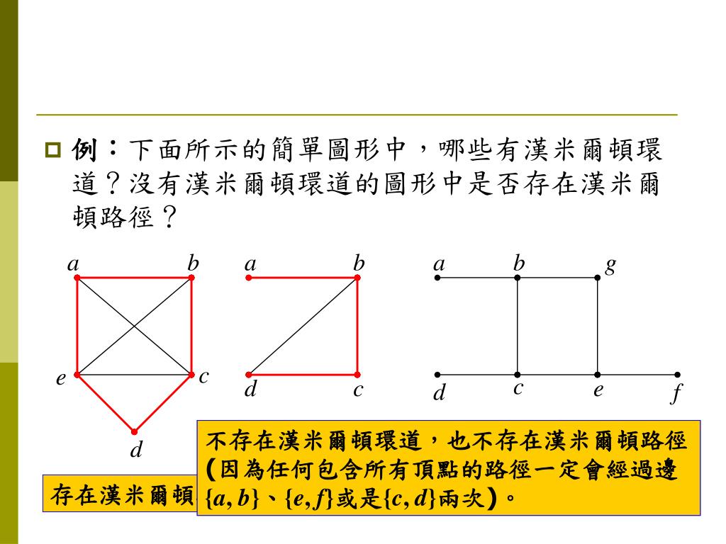 例:下面所示的簡單圖形中,哪些有漢米爾頓環道?沒有漢米爾頓環道的圖形中是否存在漢米爾頓路徑? a b a b a b g c e c d c e d f 不存在漢米爾頓環道(因為任何一個包含所有頂點的環道一定會經過邊{a, b}兩次)。但是存在漢米爾頓路徑 不存在漢米爾頓環道,也不存在漢米爾頓路徑(因為任何包含所有頂點的路徑一定會經過邊{a, b}、{e, f}或是{c, d}兩次)。 d 存在漢米爾頓環道