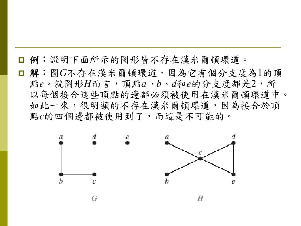 例:證明下面所示的圖形皆不存在漢米爾頓環道。例:證明下面所示的圖形皆不存在漢米爾頓環道。 • 解:圖G不存在漢米爾頓環道,因為它有個分支度為1的頂點e。就圖形H而言,頂點a、b、d和e的分支度都是2,所以每個接合這些頂點的邊都必須被使用在漢米爾頓環道中。如此一來,很明顯的不存在漢米爾頓環道,因為接合於頂點c的四個邊都被使用到了,而這是不可能的。