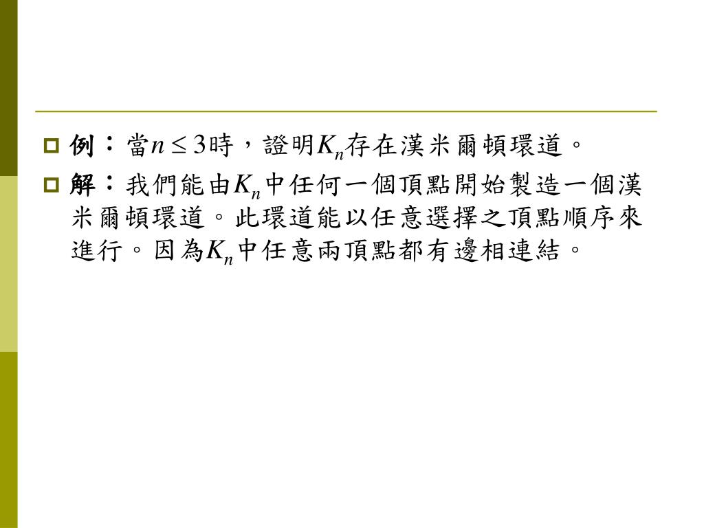 例:當n 3時,證明Kn存在漢米爾頓環道。 • 解:我們能由Kn中任何一個頂點開始製造一個漢米爾頓環道。此環道能以任意選擇之頂點順序來進行。因為Kn中任意兩頂點都有邊相連結。