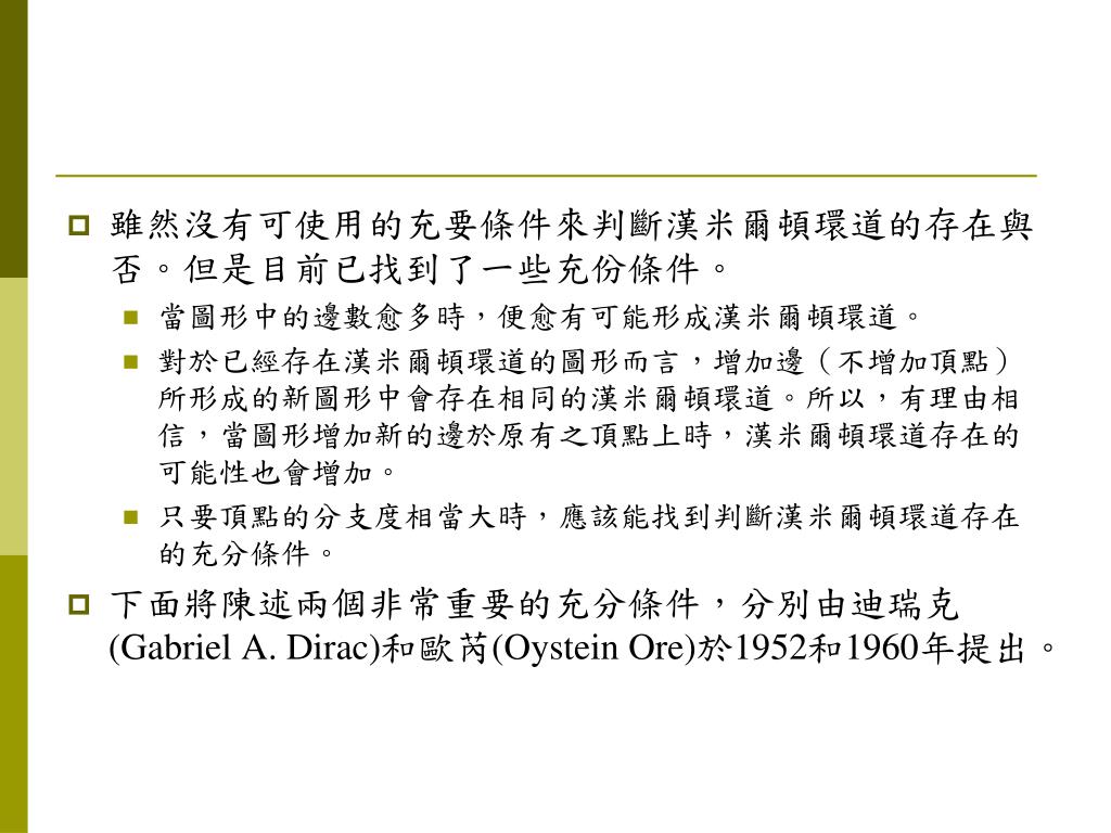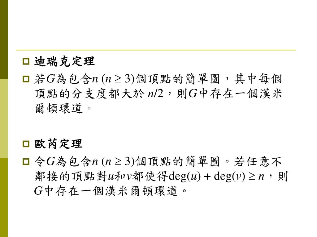 迪瑞克定理 • 若G為包含n (n 3)個頂點的簡單圖,其中每個頂點的分支度都大於 n/2,則G中存在一個漢米爾頓環道。 • 歐芮定理 • 令G為包含n (n 3)個頂點的簡單圖。若任意不鄰接的頂點對u和v都使得deg(u) + deg(v) n,則G中存在一個漢米爾頓環道。