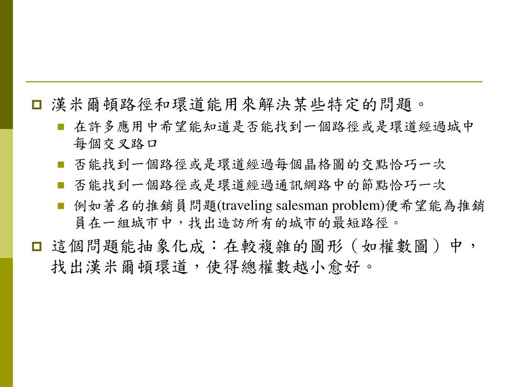 漢米爾頓路徑和環道能用來解決某些特定的問題。漢米爾頓路徑和環道能用來解決某些特定的問題。 • 在許多應用中希望能知道是否能找到一個路徑或是環道經過城中每個交叉路口 • 否能找到一個路徑或是環道經過每個晶格圖的交點恰巧一次 • 否能找到一個路徑或是環道經過通訊網路中的節點恰巧一次 • 例如著名的推銷員問題(traveling salesman problem)便希望能為推銷員在一組城市中,找出造訪所有的城市的最短路徑。 • 這個問題能抽象化成:在較複雜的圖形(如權數圖)中,找出漢米爾頓環道,使得總權數越小愈好。