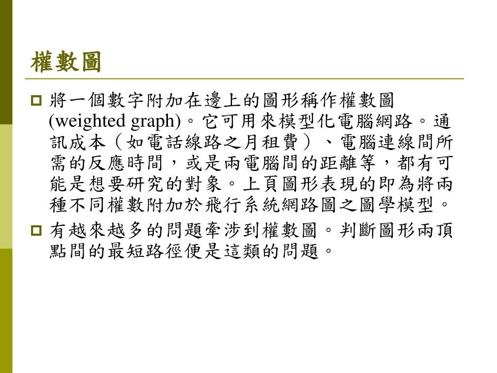 權數圖 • 將一個數字附加在邊上的圖形稱作權數圖(weighted graph)。它可用來模型化電腦網路。通訊成本(如電話線路之月租費)、電腦連線間所需的反應時間,或是兩電腦間的距離等,都有可能是想要研究的對象。上頁圖形表現的即為將兩種不同權數附加於飛行系統網路圖之圖學模型。 • 有越來越多的問題牽涉到權數圖。判斷圖形兩頂點間的最短路徑便是這類的問題。