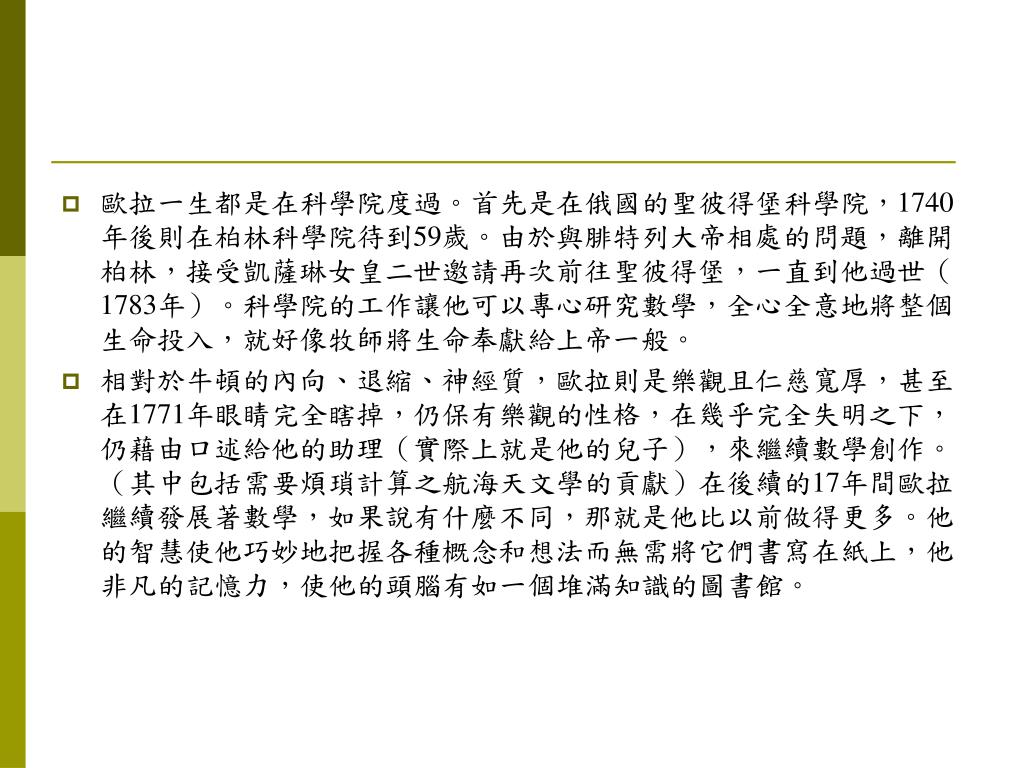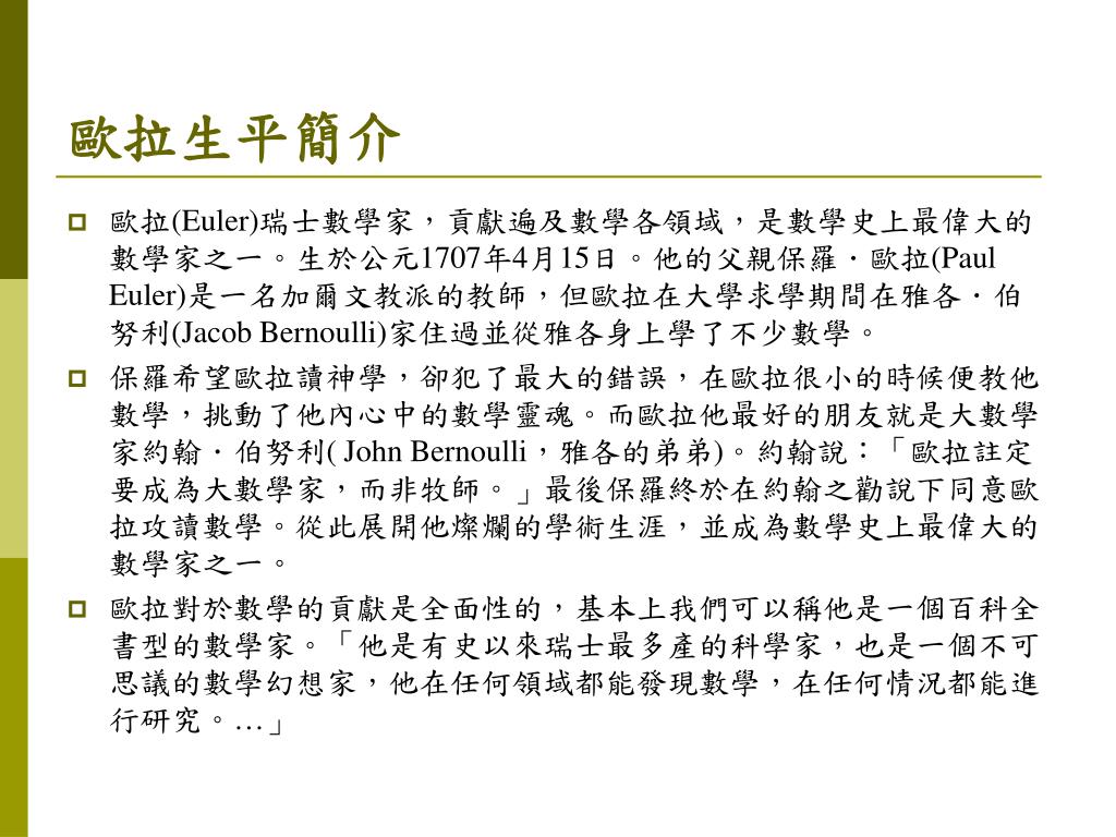 歐拉生平簡介 • 歐拉(Euler)瑞士數學家,貢獻遍及數學各領域,是數學史上最偉大的數學家之一。生於公元1707年4月15日。他的父親保羅.歐拉(Paul Euler)是一名加爾文教派的教師,但歐拉在大學求學期間在雅各.伯努利(Jacob Bernoulli)家住過並從雅各身上學了不少數學。 • 保羅希望歐拉讀神學,卻犯了最大的錯誤,在歐拉很小的時候便教他數學,挑動了他內心中的數學靈魂。而歐拉他最好的朋友就是大數學家約翰.伯努利( John Bernoulli,雅各的弟弟)。約翰說:「歐拉註定要成為大數學家,而非牧師。」最後保羅終於在約翰之勸說下同意歐拉攻讀數學。從此展開他燦爛的學術生涯,並成為數學史上最偉大的數學家之一。 • 歐拉對於數學的貢獻是全面性的,基本上我們可以稱他是一個百科全書型的數學家。「他是有史以來瑞士最多產的科學家,也是一個不可思議的數學幻想家,他在任何領域都能發現數學,在任何情況都能進行研究。…」
