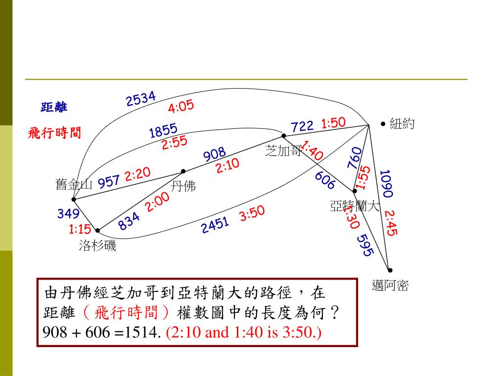 2534 距離 4:05 1:50 紐約 722 1855 飛行時間 芝加哥 2:55 1:40 908 760 2:10 丹佛 2:20 1:55 606 957 舊金山 1090 亞特蘭大 2:00 3:50 349 1:30 834 2:45 2451 1:15 洛杉磯 595 邁阿密 由丹佛經芝加哥到亞特蘭大的路徑,在 距離(飛行時間)權數圖中的長度為何? 908 + 606 =1514. (2:10 and 1:40 is 3:50.)
