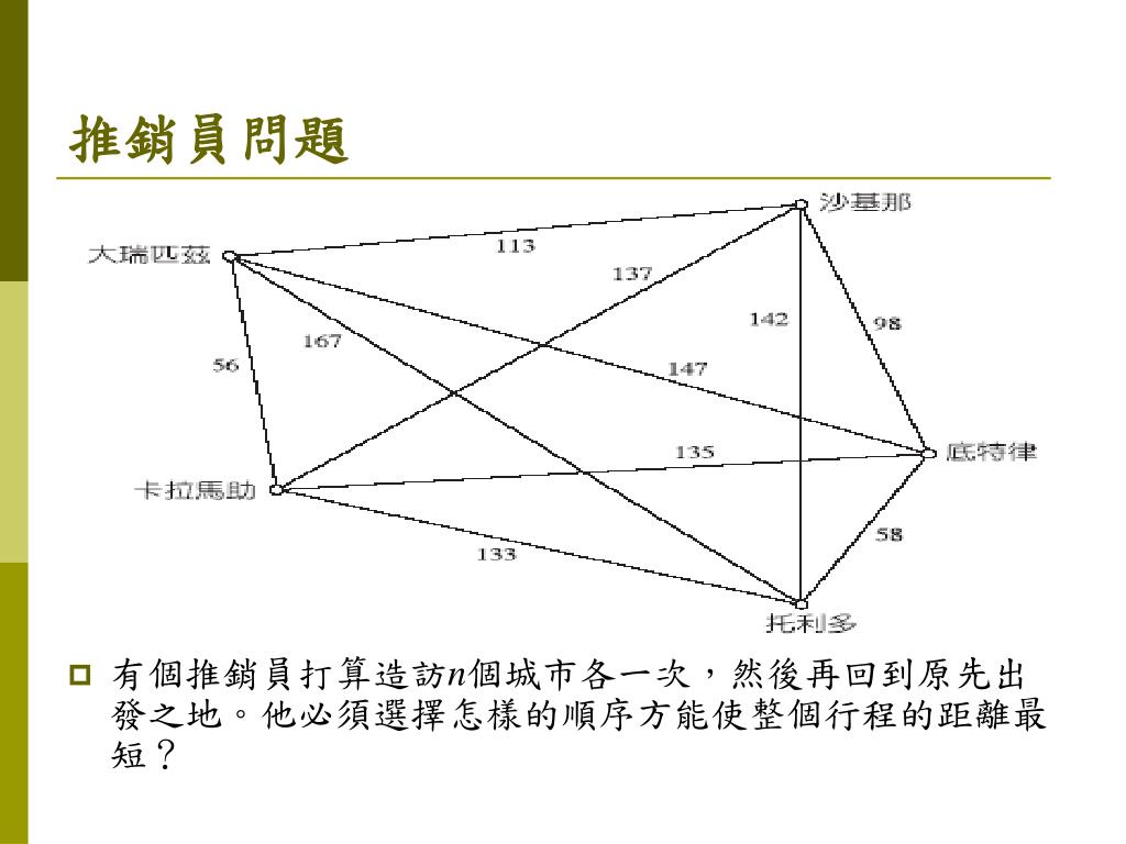 推銷員問題 • 有個推銷員打算造訪n個城市各一次,然後再回到原先出發之地。他必須選擇怎樣的順序方能使整個行程的距離最短?