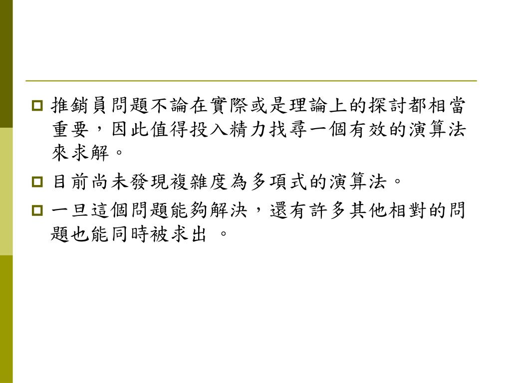 推銷員問題不論在實際或是理論上的探討都相當重要,因此值得投入精力找尋一個有效的演算法來求解。推銷員問題不論在實際或是理論上的探討都相當重要,因此值得投入精力找尋一個有效的演算法來求解。 • 目前尚未發現複雜度為多項式的演算法。 • 一旦這個問題能夠解決,還有許多其他相對的問題也能同時被求出 。