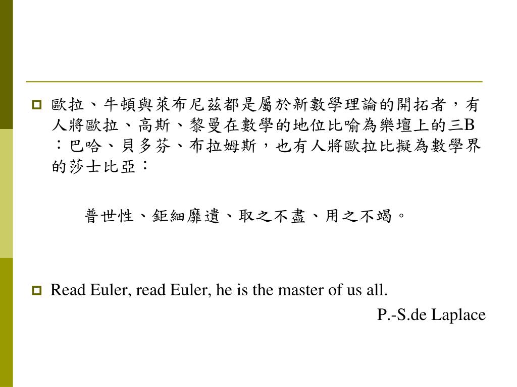 歐拉、牛頓與萊布尼茲都是屬於新數學理論的開拓者,有人將歐拉、高斯、黎曼在數學的地位比喻為樂壇上的三B:巴哈、貝多芬、布拉姆斯,也有人將歐拉比擬為數學界的莎士比亞:歐拉、牛頓與萊布尼茲都是屬於新數學理論的開拓者,有人將歐拉、高斯、黎曼在數學的地位比喻為樂壇上的三B:巴哈、貝多芬、布拉姆斯,也有人將歐拉比擬為數學界的莎士比亞: 普世性、鉅細靡遺、取之不盡、用之不竭。 • Read Euler, read Euler, he is the master of us all. P.-S.de Laplace