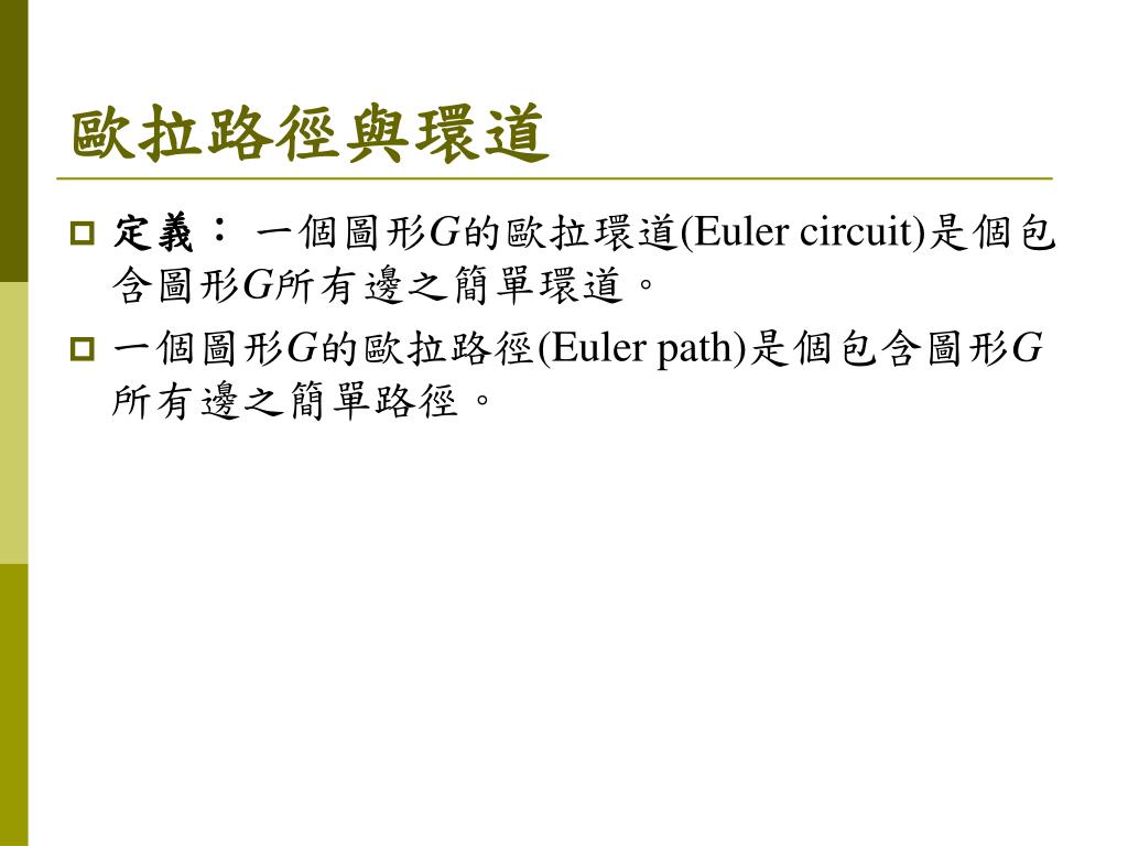 歐拉路徑與環道 • 定義: 一個圖形G的歐拉環道(Euler circuit)是個包含圖形G所有邊之簡單環道。 • 一個圖形G的歐拉路徑(Euler path)是個包含圖形G所有邊之簡單路徑。