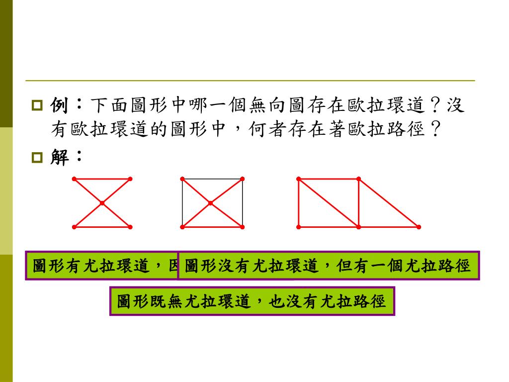 例:下面圖形中哪一個無向圖存在歐拉環道?沒有歐拉環道的圖形中,何者存在著歐拉路徑? • 解: 圖形有尤拉環道,因此有尤拉路徑 圖形沒有尤拉環道,但有一個尤拉路徑 圖形既無尤拉環道,也沒有尤拉路徑