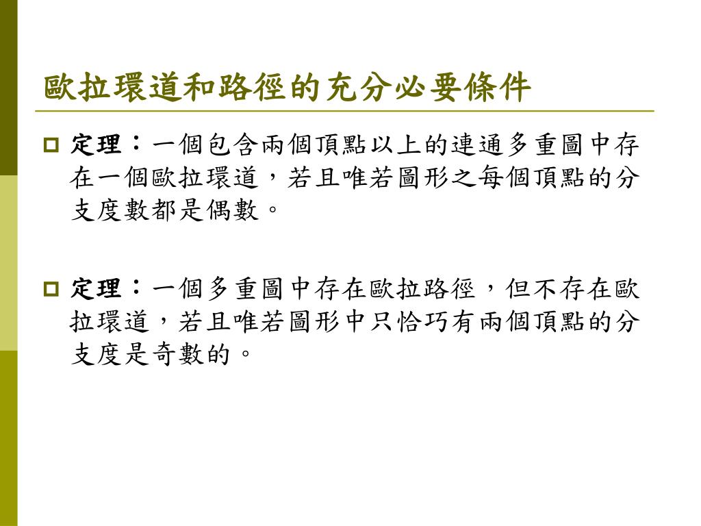 歐拉環道和路徑的充分必要條件 • 定理:一個包含兩個頂點以上的連通多重圖中存在一個歐拉環道,若且唯若圖形之每個頂點的分支度數都是偶數。 • 定理:一個多重圖中存在歐拉路徑,但不存在歐拉環道,若且唯若圖形中只恰巧有兩個頂點的分支度是奇數的。