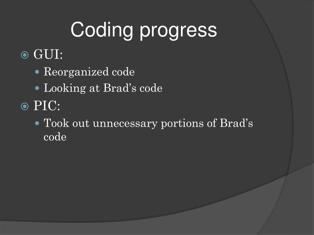 Coding progress • GUI: • Reorganized code • Looking at Brad’s code • PIC: • Took out unnecessary portions of Brad’s code