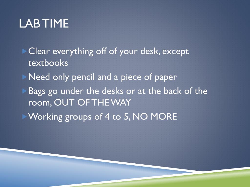 Lab Time • Clear everything off of your desk, except textbooks • Need only pencil and a piece of paper • Bags go under the desks or at the back of the room, OUT OF THE WAY • Working groups of 4 to 5, NO MORE