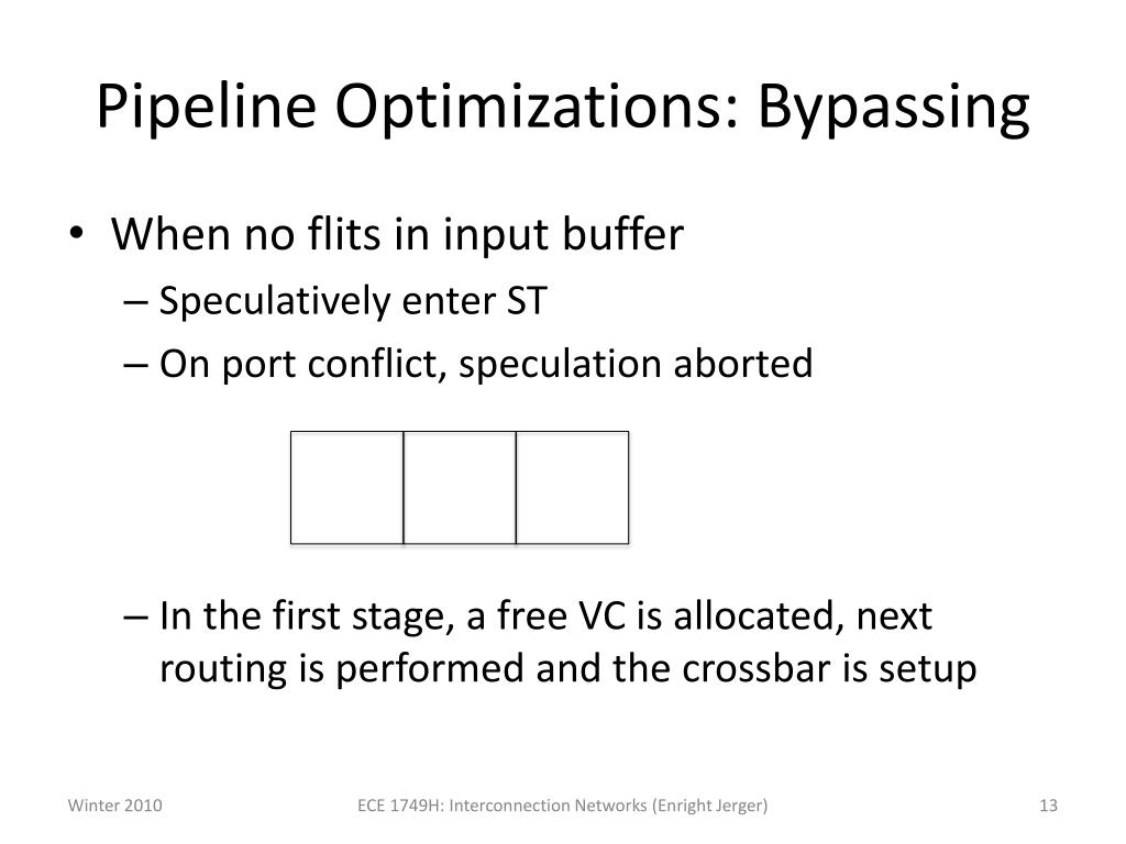 Pipeline Optimizations: Bypassing • When no flits in input buffer • Speculatively enter ST • On port conflict, speculation aborted • In the first stage, a free VC is allocated, next routing is performed and the crossbar is setup VA RC Setup ST LT ECE 1749H: Interconnection Networks (Enright Jerger)