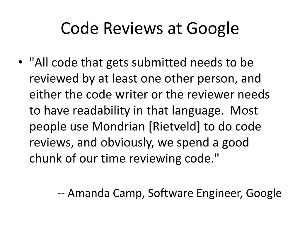 Code Reviews at Google • "All code that gets submitted needs to be reviewed by at least one other person, and either the code writer or the reviewer needs to have readability in that language. Most people use Mondrian [Rietveld] to do code reviews, and obviously, we spend a good chunk of our time reviewing code." -- Amanda Camp, Software Engineer, Google