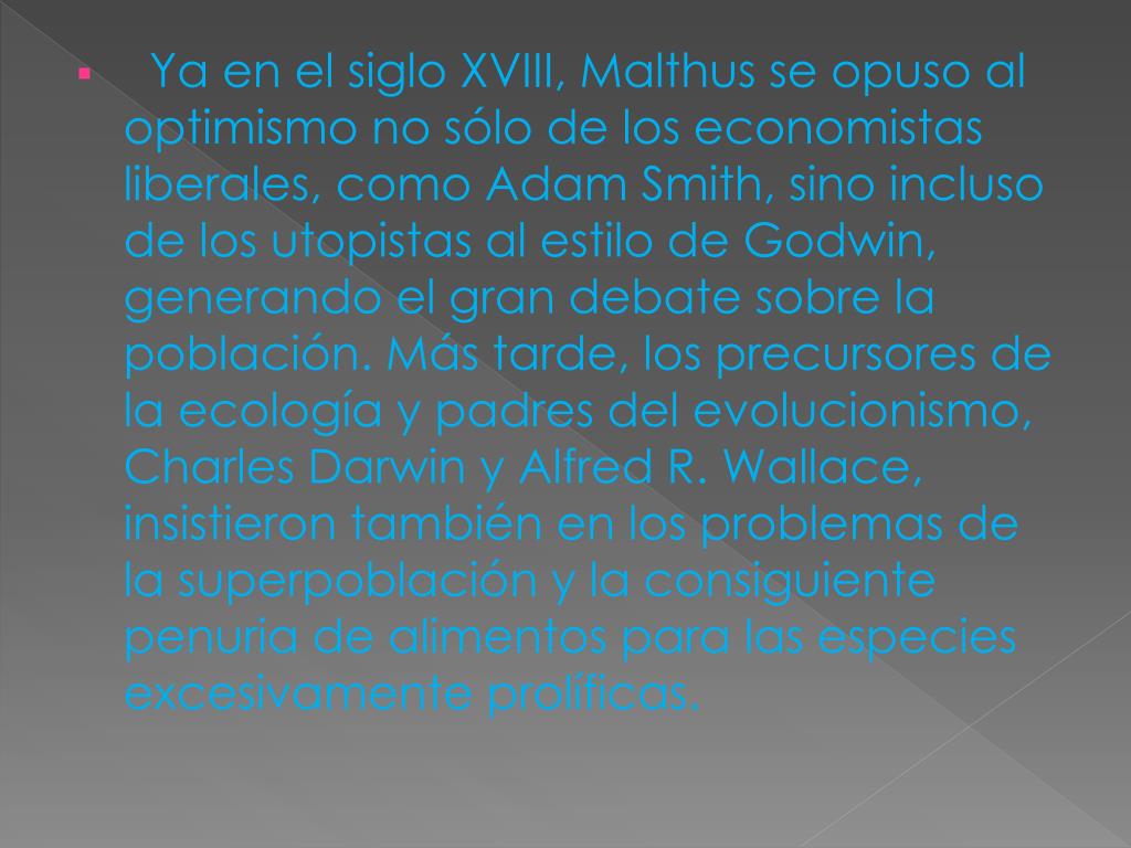 Ya en el siglo XVIII, Malthus se opuso al optimismo no sólo de los economistas liberales, como Adam Smith, sino incluso de los utopistas al estilo de Godwin, generando el gran debate sobre la población. Más tarde, los precursores de la ecología y padres del evolucionismo, Charles Darwin y Alfred R. Wallace, insistieron también en los problemas de la superpoblación y la consiguiente penuria de alimentos para las especies excesivamente prolíficas.