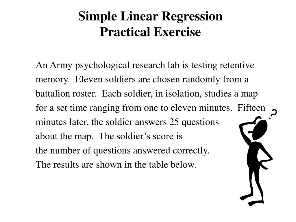 Simple Linear RegressionPractical Exercise An Army psychological research lab is testing retentive memory. Eleven soldiers are chosen randomly from a battalion roster. Each soldier, in isolation, studies a map for a set time ranging from one to eleven minutes. Fifteen minutes later, the soldier answers 25 questions about the map. The soldier’s score is the number of questions answered correctly. The results are shown in the table below.