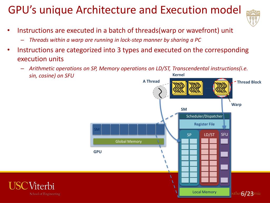 GPU’s unique Architecture and Execution model • Instructions are executed in a batch of threads(warp or wavefront) unit • Threads within a warp are running in lock-step manner by sharing a PC • Instructions are categorized into 3 types and executed on the corresponding execution units • Arithmetic operations on SP, Memory operations on LD/ST, Transcendental instructions(i.e. sin, cosine) on SFU Scheduler/Dispatcher SM Register File SP LD/ST SFU Kernel A Thread Thread Block SM ... Global Memory Warp GPU Local Memory