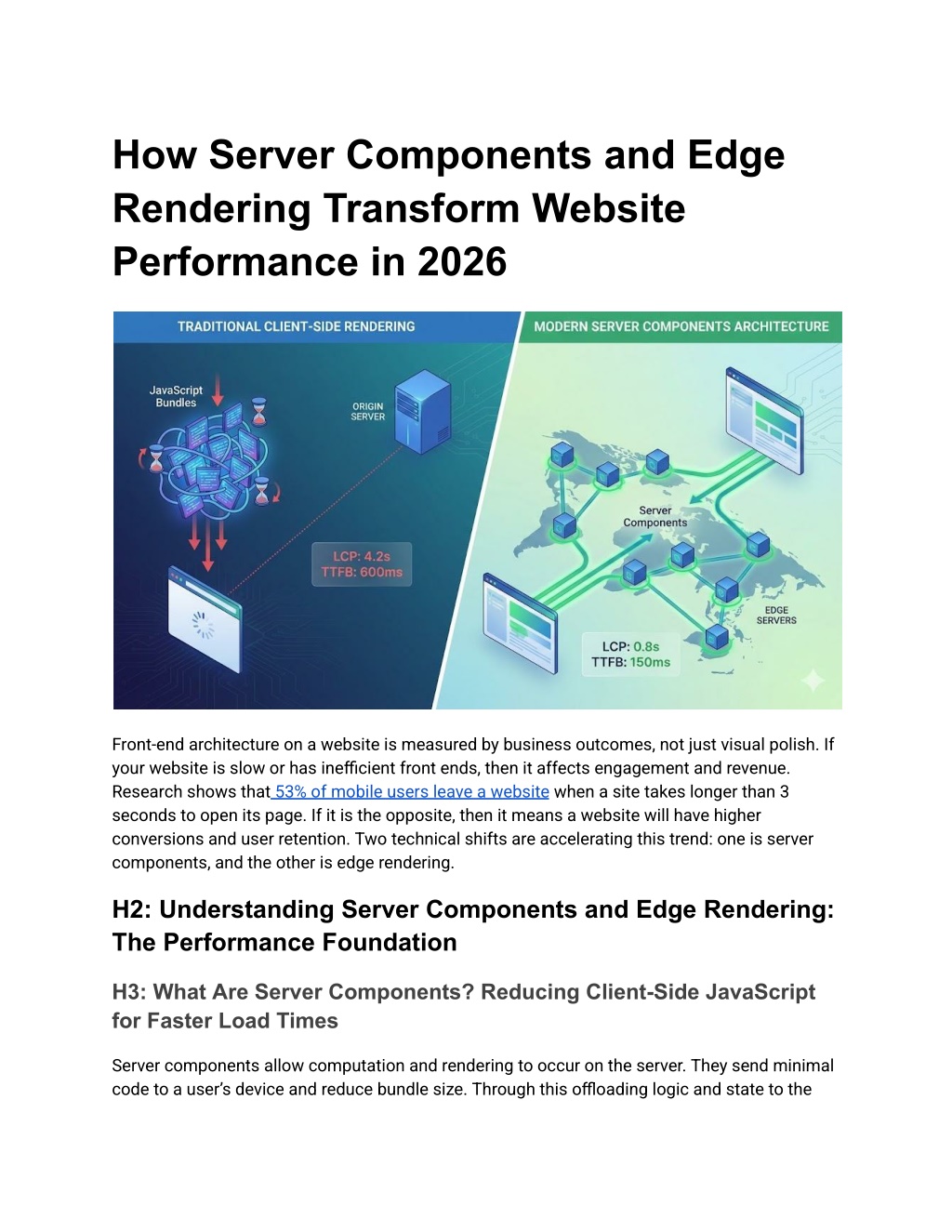 How Server Components and Edge Rendering Transform Website Performance in 2026 Front-end architecture on a website is measured by business outcomes, not just visual polish. If your website is slow or has inefficient front ends, then it affects engagement and revenue. Research shows that 53% of mobile users leave a website when a site takes longer than 3 seconds to open its page. If it is the opposite, then it means a website will have higher conversions and user retention. Two technical shifts are accelerating this trend: one is server components, and the other is edge rendering. H2: Understanding Server Components and Edge Rendering: The Performance Foundation H3: What Are Server Components? Reducing Client-Side JavaScript for Faster Load Times Server components allow computation and rendering to occur on the server. They send minimal code to a user’s device and reduce bundle size. Through this offloading logic and state to the