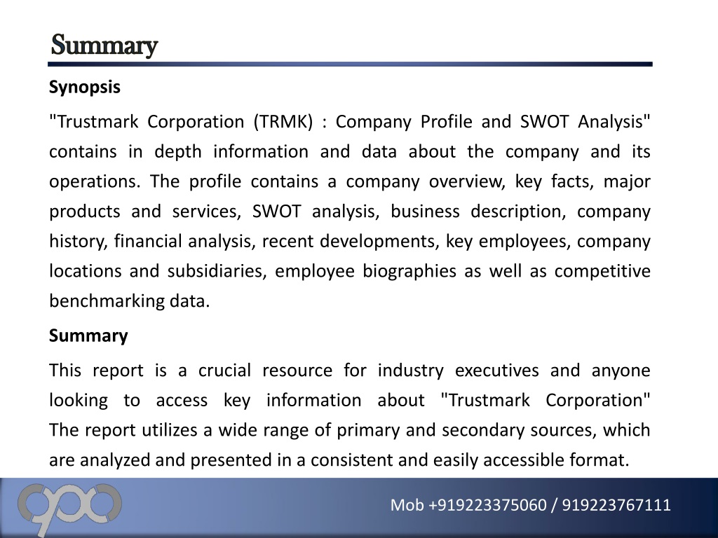 Scope Examines and identifies key information and issues about "Trustmark Corporation" for business intelligence requirements. Studies and presents the company's strengths, weaknesses, opportunities (growth potential) and threats (competition). Strategic and operational business information is objectively reported. Provides data on company financial performance and competitive benchmarking. The profile also contains information on business operations, company history, major products and services, key employees, and locations and subsidiaries. Mob +919223375060 / 919223767111