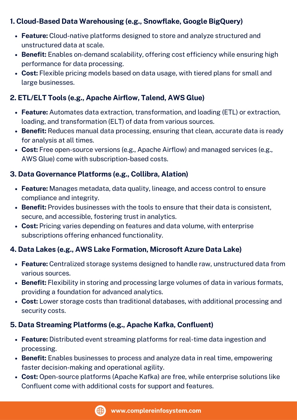 1. Cloud-Based Data Warehousing (e.g., Snowflake, Google BigQuery) Feature: Cloud-native platforms designed to store and analyze structured and unstructured data at scale. Benefit: Enables on-demand scalability, offering cost efficiency while ensuring high performance for data processing. Cost: Flexible pricing models based on data usage, with tiered plans for small and large businesses. 2. ETL/ELT Tools (e.g., Apache Airflow, Talend, AWS Glue) Feature: Automates data extraction, transformation, and loading (ETL) or extraction, loading, and transformation (ELT) of data from various sources. Benefit: Reduces manual data processing, ensuring that clean, accurate data is ready for analysis at all times. Cost: Free open-source versions (e.g., Apache Airflow) and managed services (e.g., AWS Glue) come with subscription-based costs. 3. Data Governance Platforms (e.g., Collibra, Alation) Feature: Manages metadata, data quality, lineage, and access control to ensure compliance and integrity. Benefit: Provides businesses with the tools to ensure that their data is consistent, secure, and accessible, fostering trust in analytics. Cost: Pricing varies depending on features and data volume, with enterprise subscriptions offering enhanced functionality. 4. Data Lakes (e.g., AWS Lake Formation, Microsoft Azure Data Lake) Feature: Centralized storage systems designed to handle raw, unstructured data from various sources. Benefit: Flexibility in storing and processing large volumes of data in various formats, providing a foundation for advanced analytics. Cost: Lower storage costs than traditional databases, with additional processing and security costs. 5. Data Streaming Platforms (e.g., Apache Kafka, Confluent) Feature: Distributed event streaming platforms for real-time data ingestion and processing. Benefit: Enables businesses to process and analyze data in real time, empowering faster decision-making and operational agility. Cost: Open-source platforms (Apache Kafka) are free, while enterprise solutions like Confluent come with additional costs for support and features. www.complereinfosystem.com