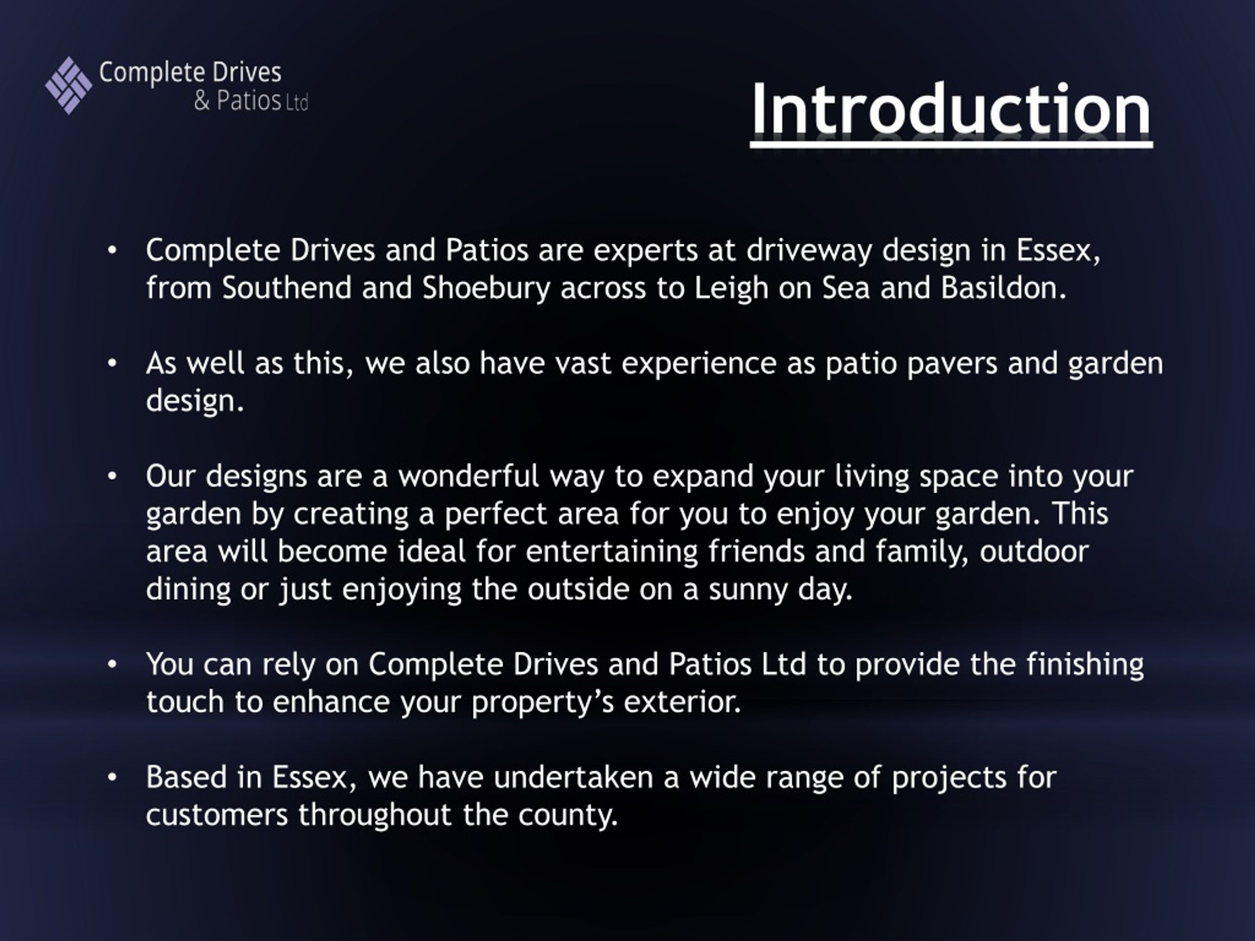 Complete Drives and Patios are experts at driveway design in Essex, from Southend and Shoebury across to Leigh on Sea and Basildon. • As well as this, we also have vast experience as patio pavers and garden design. • Our designs are a wonderful way to expand your living space into your garden by creating a perfect area for you to enjoy your garden. This area will become ideal for entertaining friends and family, outdoor dining or just enjoying the outside on a sunny day. • You can rely on Complete Drives and Patios Ltd to provide the finishing touch to enhance your property’s exterior. • Based in Essex, we have undertaken a wide range of projects for customers throughout the county. Introduction