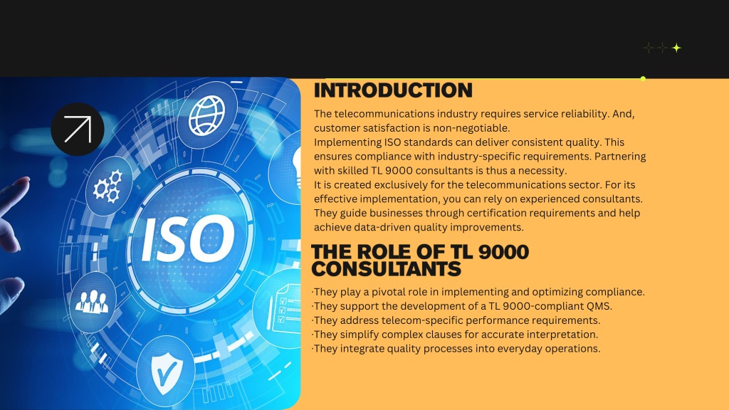 INTRODUCTION The telecommunicationsindustry requires service reliability. And, customer satisfaction is non-negotiable. Implementing ISO standards can deliver consistent quality. This ensures compliance with industry-specific requirements. Partnering with skilled TL 9000 consultants is thus a necessity. It is created exclusively for the telecommunications sector. For its effective implementation, you can rely on experienced consultants. They guide businesses through certification requirements and help achieve data-driven quality improvements. • THE ROLE OF TL 9000 CONSULTANTS ·They play a pivotal role in implementing and optimizing compliance. ·They support the development of a TL 9000-compliant QMS. ·They address telecom-specific performance requirements. ·They simplify complex clauses for accurate interpretation. ·They integrate quality processes into everyday operations.