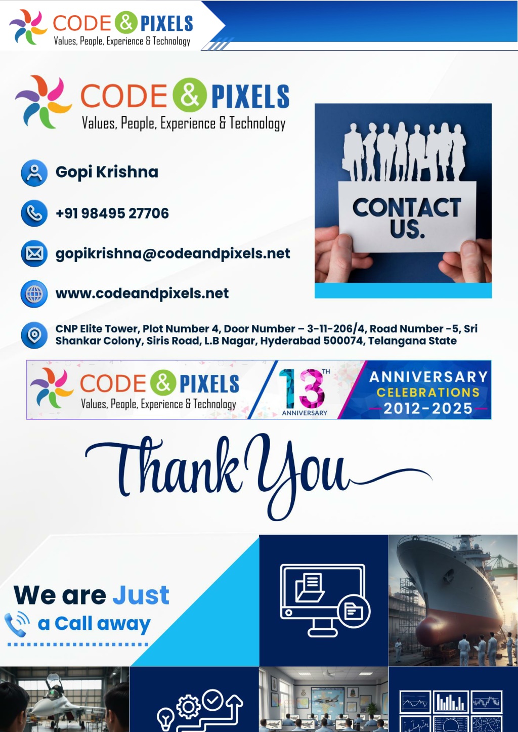7. •Eco-friendly documentation practice •Alignment with Digital India and Atmanirbhar Bharat initiatives Key Measurable Benefits Parameter Before IETM/CBT After Implementation Training Time 100% baseline Reduced by 30–40% Maintenance Error Rate High due to manual lookup Reduced by 60% Documentation Update Time Weeks to months Within hours Operational Downtime Long during fault diagnosis Reduced by 50% Knowledge Retention (Training) 50–60% Improved to 85–90% CODEANDPIXELS.NET IETM@CODEANDPIXELS.NET 9849527706 Page 7