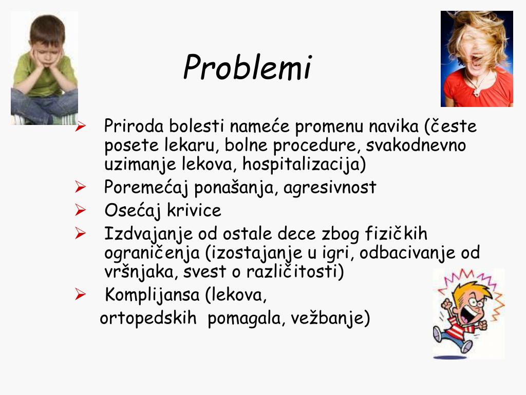 Problemi Priroda bolesti nameće promenu navika (česte posete lekaru, bolne procedure, svakodnevno uzimanje lekova, hospitalizacija) Poremećaj ponašanja, agresivnost Osećaj krivice Izdvajanje od ostale dece zbog fizičkih ograničenja (izostajanje u igri, odbacivanje od vršnjaka, svest o različitosti) Komplijansa (lekova, ortopedskih pomagala, vežbanje)