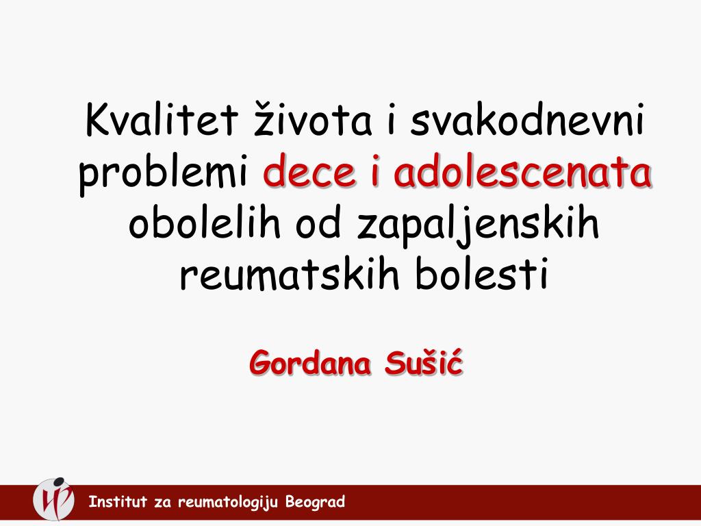 Kvalitet života i svakodnevni problemi dece i adolescenata obolelih od zapaljenskih reumatskih bolesti Gordana Sušić Institut zareumatologiju Beograd