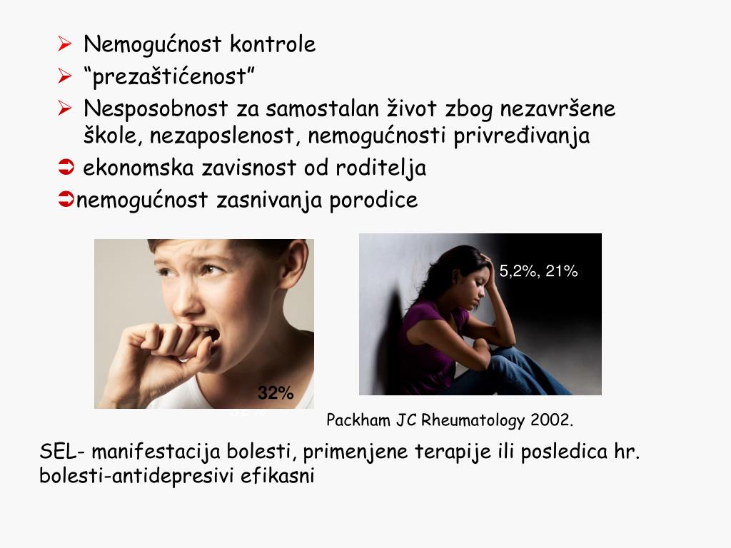 Nemogućnost kontrole • “prezaštićenost” • Nesposobnost za samostalan život zbog nezavršene škole, nezaposlenost, nemogućnosti privređivanja ekonomska zavisnost od roditelja nemogućnost zasnivanja porodice 5,2%, 21% 32% 32% Packham JC Rheumatology 2002. SEL- manifestacija bolesti, primenjene terapije ili posledica hr. bolesti-antidepresivi efikasni