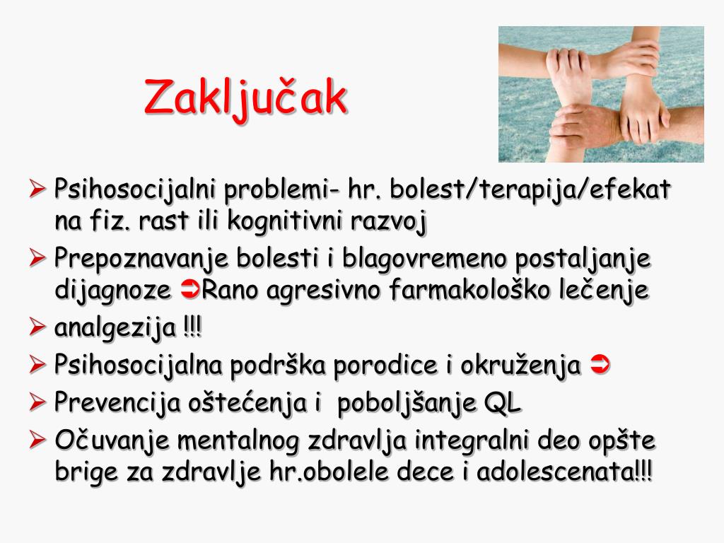 Psihosocijalni problemi- hr. bolest/terapija/efekat na fiz. rast ili kognitivni razvoj Prepoznavanje bolesti i blagovremeno postaljanje dijagnoze Rano agresivno farmakološko lečenje analgezija !!! Psihosocijalna podrška porodice i okruženja Prevencija oštećenja i poboljšanje QL Očuvanje mentalnog zdravlja integralni deo opšte brige za zdravlje hr.obolele dece i adolescenata!!! Zaključak
