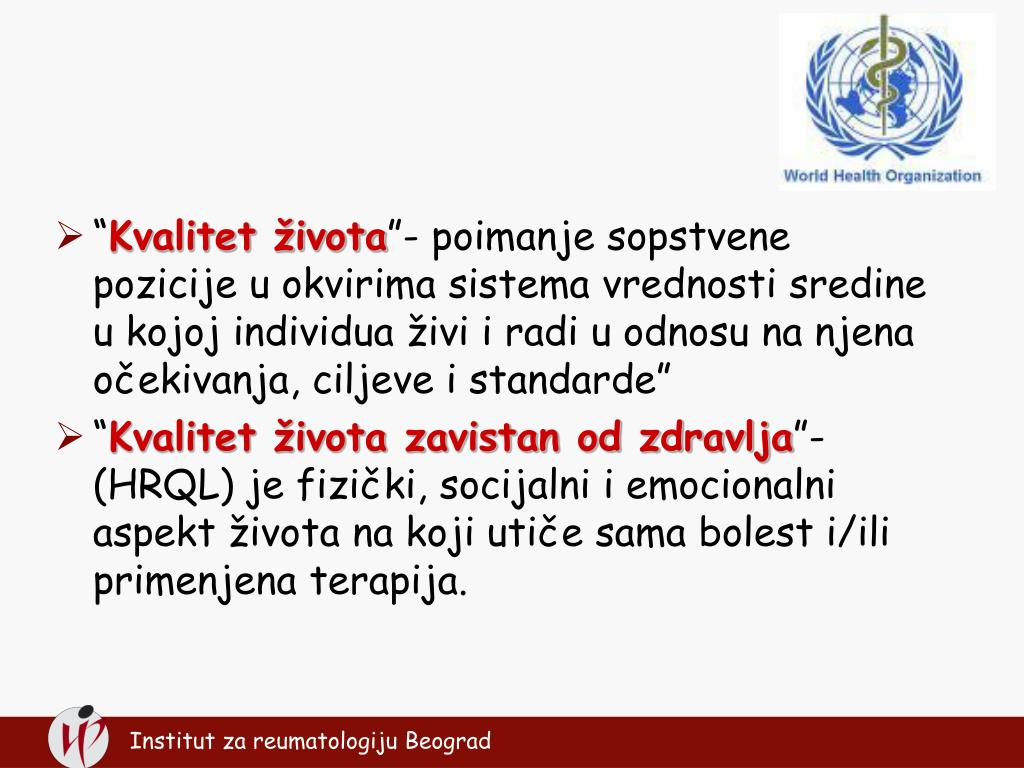 “Kvalitet života”- poimanje sopstvene pozicije u okvirima sistema vrednosti sredine u kojoj individua živi i radi u odnosu na njena očekivanja, ciljeve i standarde” “Kvalitet života zavistan od zdravlja”- (HRQL) je fizički, socijalni i emocionalni aspekt života na koji utiče sama bolest i/ili primenjena terapija. Institut zareumatologiju Beograd