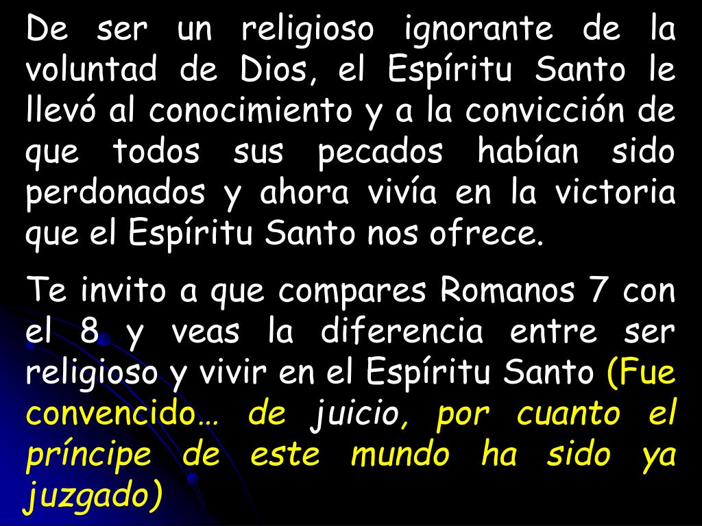 De ser un religioso ignorante de la voluntad de Dios, el Espíritu Santo le llevó al conocimiento y a la convicción de que todos sus pecados habían sido perdonados y ahora vivía en la victoria que el Espíritu Santo nos ofrece. Te invito a que compares Romanos 7 con el 8 y veas la diferencia entre ser religioso y vivir en el Espíritu Santo (Fue convencido… de juicio, por cuanto el príncipe de este mundo ha sido ya juzgado)
