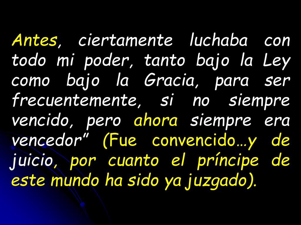 Antes, ciertamente luchaba con todo mi poder, tanto bajo la Ley como bajo la Gracia, para ser frecuentemente, si no siempre vencido, pero ahora siempre era vencedor” (Fue convencido…y de juicio, por cuanto el príncipe de este mundo ha sido ya juzgado).