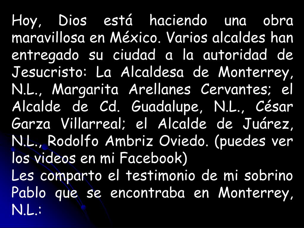 Hoy, Dios está haciendo una obra maravillosa en México. Varios alcaldes han entregado su ciudad a la autoridad de Jesucristo: La Alcaldesa de Monterrey, N.L., Margarita Arellanes Cervantes; el Alcalde de Cd. Guadalupe, N.L., César Garza Villarreal; el Alcalde de Juárez, N.L., Rodolfo Ambriz Oviedo. (puedes ver los videos en mi Facebook) Les comparto el testimonio de mi sobrino Pablo que se encontraba en Monterrey, N.L.: