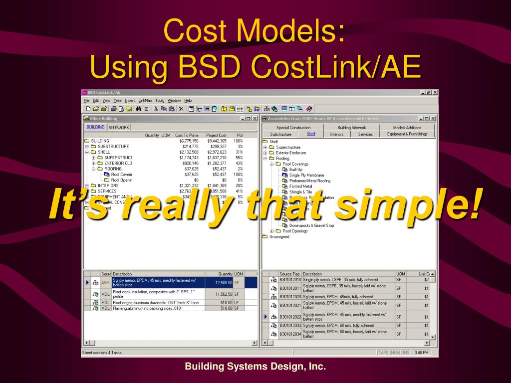 Cost Models: Using BSD CostLink/AE It’s really that simple! Building Systems Design, Inc.